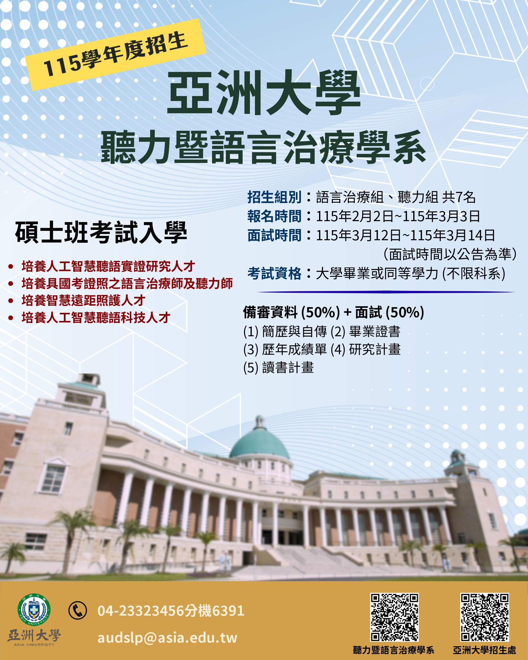三、 詳細招生資訊請至本校招生資訊網(網址:https://rd.asia.edu.tw/p/412-1002-90.php?Lang=zh-tw),或聽力暨語言治療學系招生專區(網址:https://reurl.cc/NN8ed5)查詢。