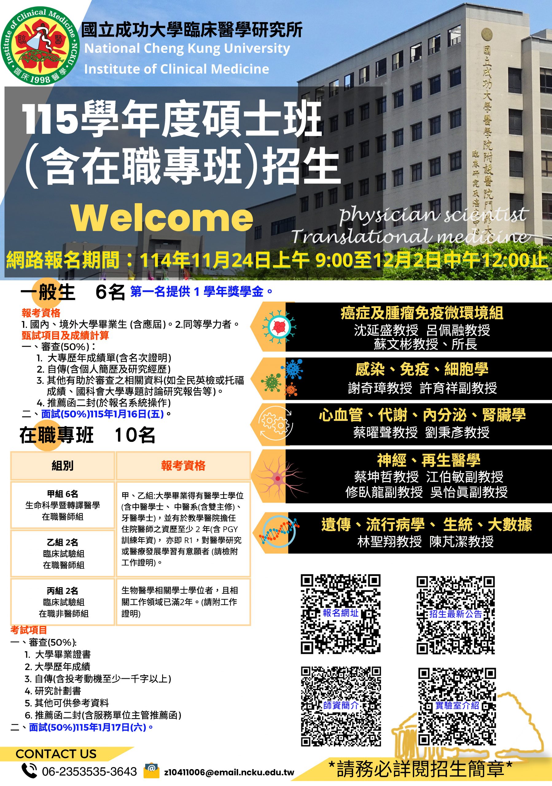【招生公告-本所網站】https://icmmed.ncku.edu.tw/p/406-1113-289633,r1235.php?Lang=zh-tw